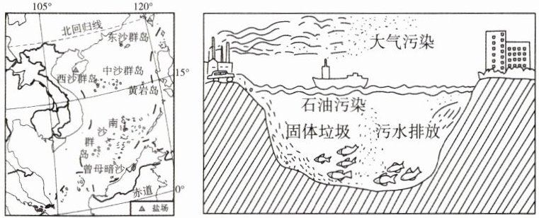 海洋是人类发展的资源宝库,保护我们的“蓝色国土”需要实施综合管理。下面为中国南海盐场分布图和海洋污染示意图。读图,回答 8~9 题。