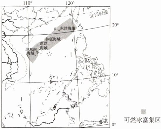 天然气水合物又称可燃冰,是一种由水和天然气在高压、低温条件下形成的固态物质,其外观类似于冰雪或酒精,由于可燃冰主要存在于海底和永久冻土层中,其开采难度较大。读我国南海可燃冰富集区域示意图,回答 6~7 题。