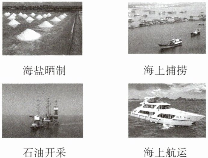 (潍坊期中)山东省潍坊市开发利用海洋历史悠久,主要利用类型有渔业养殖、海盐晒制、石油开采、海上航运等。近年来,随着生态环境保护工作的推进,对海洋的开发利用也做出了严格限制。下面为海洋主要利用类型示意图。据此回答 6~7 题。