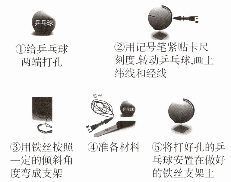 [学科素养](青岛李沧阶段)为进一步认识地球,某校七年级学生举办了“制作简易地球仪”的活动。下面是制作简易地球仪的过程图。读图,回答9~10题。
