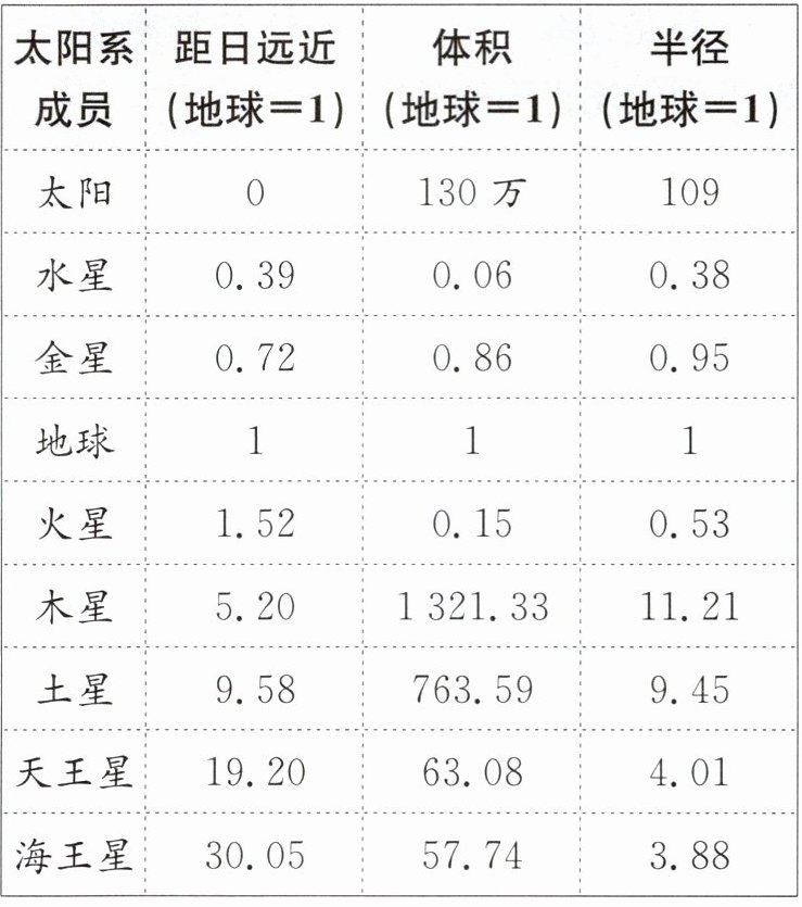 (2)根据表中数据可知,地球直径为太阳直径的1/109,模型中用一个直径约1.5米的大球代表太阳,则地球直径为1.5米×1/109≈0.014(米),即1.4厘米,故适合代表地球的是①小玻璃球。直径约1.5米的大球代表太阳(太阳直径约140万千米),根据其大小比例,日地平均距离为1.5亿千米,所以在模型中日地距离大约为1.5米/140万千米×1.5亿千米≈161米,海王星距日距离是日地距离的30多倍,所以该模型适合摆放在空旷的野外;课桌、教室、操场空间太小。