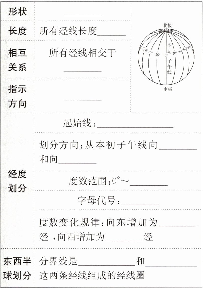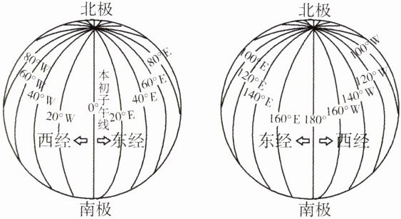 半圆弧 相等 极点 南北方向 0°经线(或:本初子午线) 东 西 180° E、W 东 西 西经20°(或:20°W) 东经160°(或:160°E)