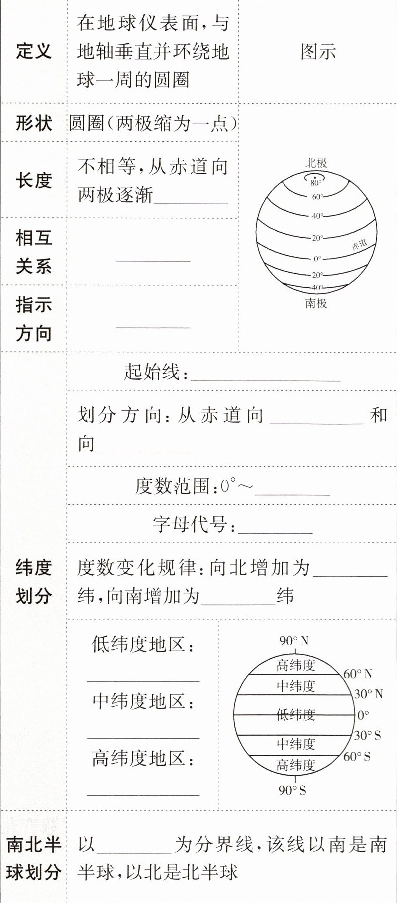 缩短 平行 东西方向 0°纬线(或:赤道) 北 南 90° N、S 北 南 0°~30° 30°~60° 60°~90° 赤道