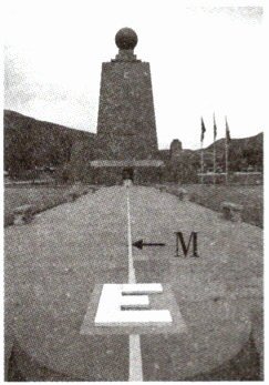 (内江中考改编)如图为厄瓜多尔方柱形赤道纪念碑。一位游客面向东方,双脚跨在 M 线两侧拍照,以示自己同时站在南北两个半球上。据此回答 4~5 题。