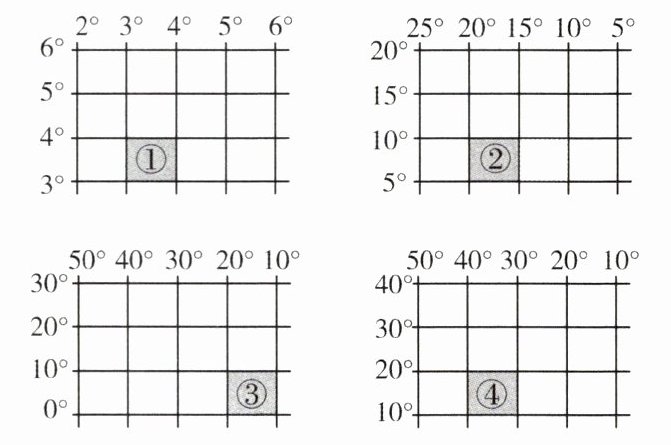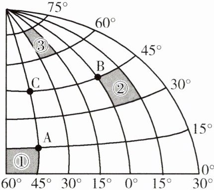 (3)纬度越低,纬线越长。①②③三块阴影,①所在的纬度最低,③所在的纬度最高,①②③三块阴影所跨的经线长度相等,所以面积最大的区域是①,最小的是③。