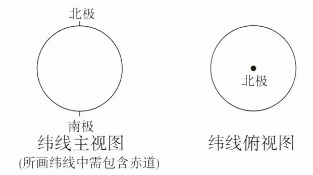 (4)沿纬线切开橘子,在下面绘制纬线的主视(从侧面观察)图、俯视(从北极上空观察)图。