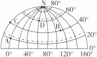 [新情境]小雨在课后学习围棋时,在棋盘上以某一点为极点,绘制出简易经纬网,有几个棋子恰好落在其所绘制的几条经纬线上。读简易经纬网图,回答 4~5 题。