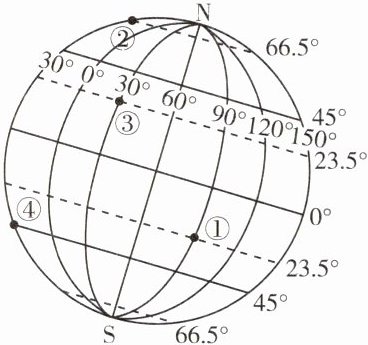 (1)①位于南半球、东半球;②位于北半球、西半球;③位于北半球、东半球;④位于南半球、西半球。