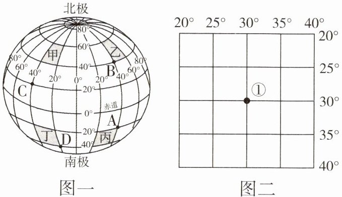 (甲或乙或丙或丁),①点的经纬度是______(30°S,30°E)