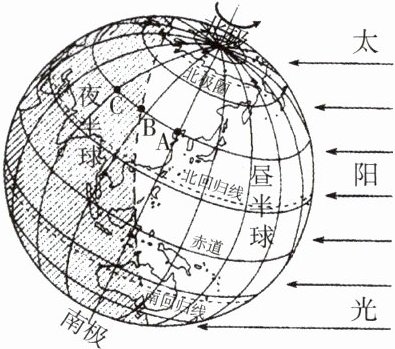 图中箭头表示自东向西,不符合地球自转方向,所以C错误。