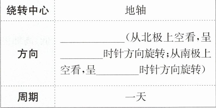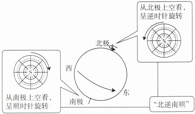 地球自转方向是自西向东,从北极上空看是逆时针方向,从南极上空看是顺时针方向。