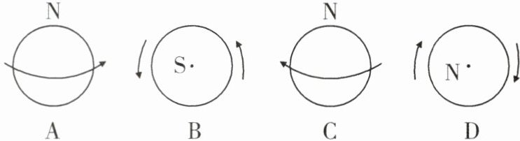 图中是北极点($N$表示北极),从北极上空看地球自转方向应为逆时针,而此图是顺时针,所以D错误。