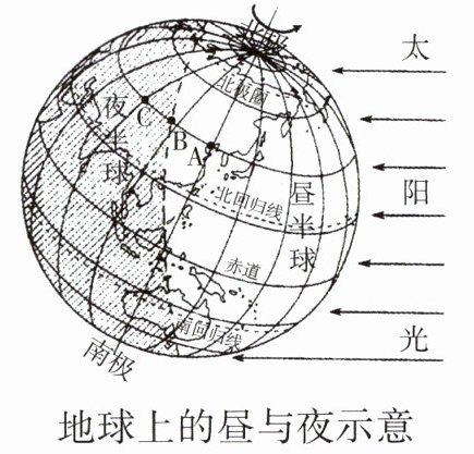 我国古代劳动人民在数千年的历史发展中形成了“日出而作,日落而息”的规律,顺应天地的生存法则。读地球上的昼与夜示意图,回答 1~2 题。