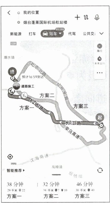 [核心素养](烟台中考)小明在省外读书,开学季爸爸开车送他去机场。出发前,小明用手机软件查看路况。下面是小明查阅的电子地图截图。读图,回答 3~5 题。