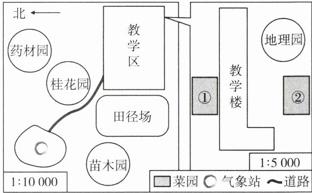 1.D [解析]药材园、桂花园、苗木园图幅大小相同,且比例尺相同,所以其实地面积相同,地理园与其他三园图幅大小相同,但比例尺更大,所以其实地面积比其他三园小。2.C