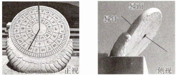 ①一天中太阳位置与晷针影子位置的关系 ②一年中正午太阳高度与晷针影子长度的关系 ③地球自转原理 ④地球公转原理