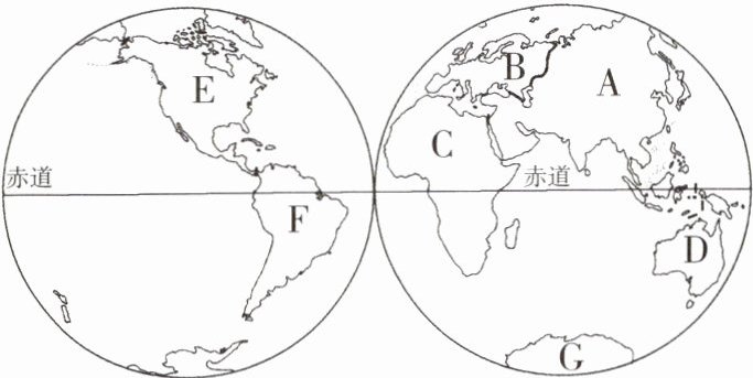 ②主要位于北半球的大洲是 A**亚洲**、B**欧洲**、E**北美洲**;主要位于南半球的大洲是 G**南极洲**、D**大洋洲**、F**南美洲**。