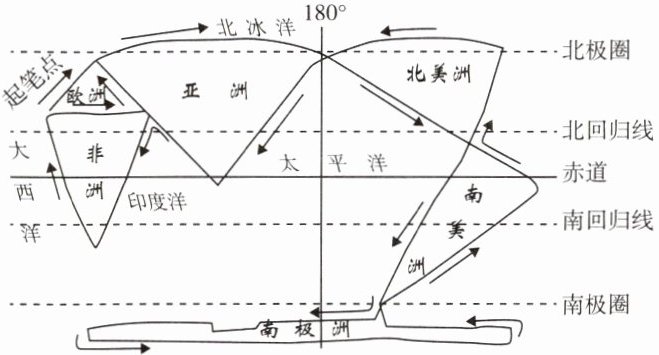 小顺同学通过“一笔画世界”活动学习世界的海陆分布。读小顺同学的作品图,回答 9~11 题。