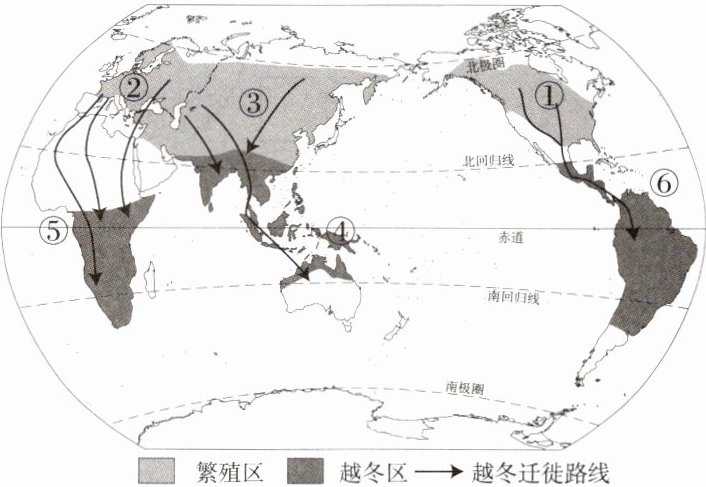 [跨学科]一曲“小燕子,穿花衣……”的童谣可以勾起无数人对童年的回忆。其实小燕子的学名是家燕,它们的繁殖地非常固定,每年返回同一片区域繁殖。读家燕的越冬迁徙路线图,回答 5~6 题。