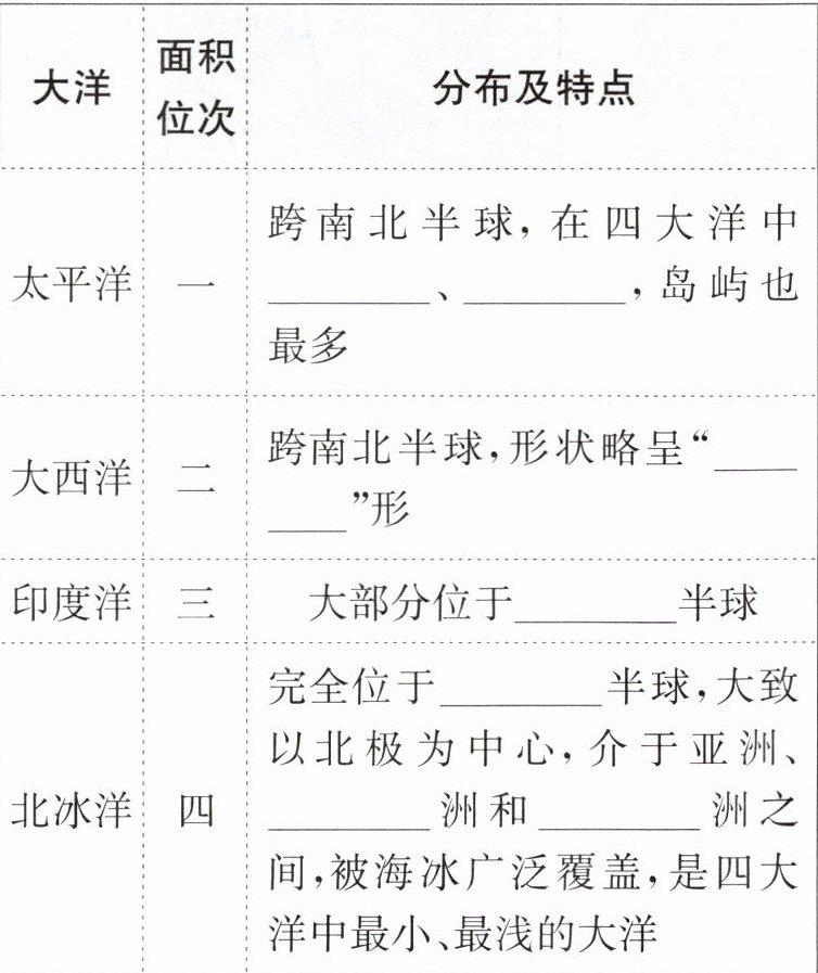跨东、西、南、北四个半球的大洋有太平洋和大西洋;纬度最高、跨经度最广、面积最小、主要位于寒带的大洋是北冰洋;主要位于热带的大洋是印度洋。
