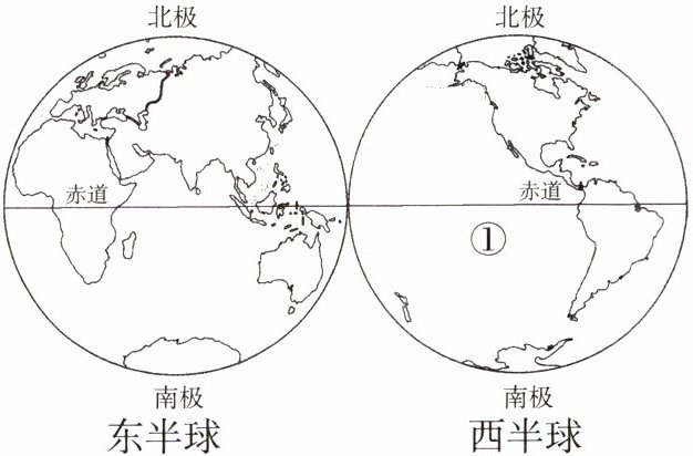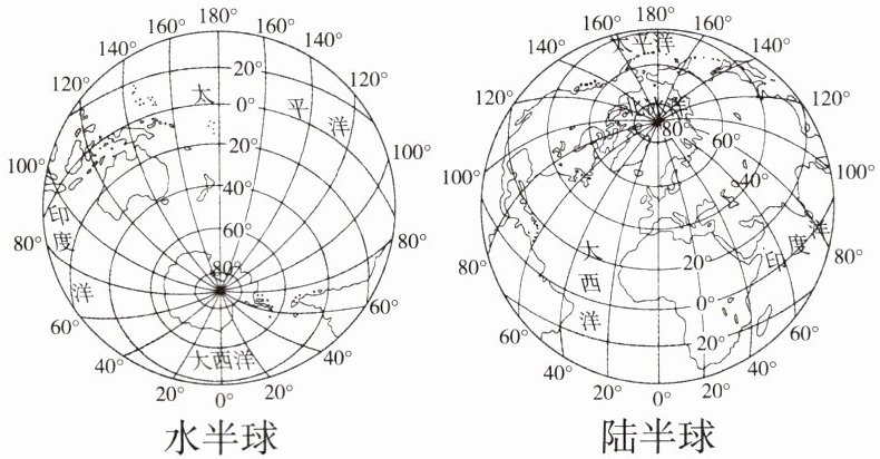 [新情境]小军学习了“世界的海陆分布”后,将重点知识进行了梳理。读水半球和陆半球图,回答1~2题。