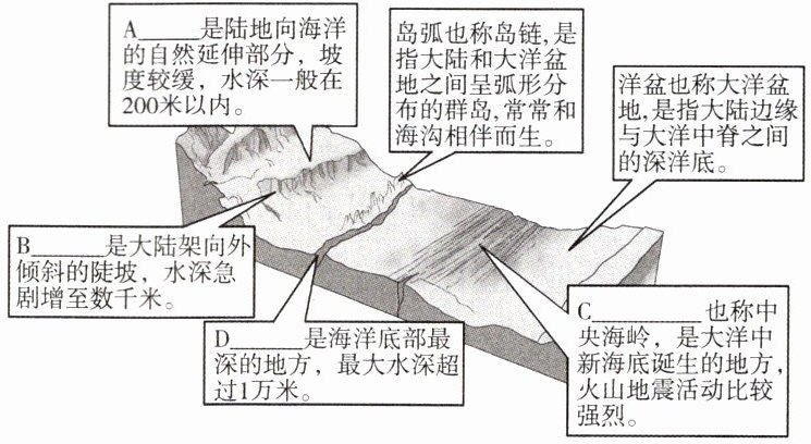 B大陆坡是大陆架向外倾斜的陡坡,水深急剧增至数千米。