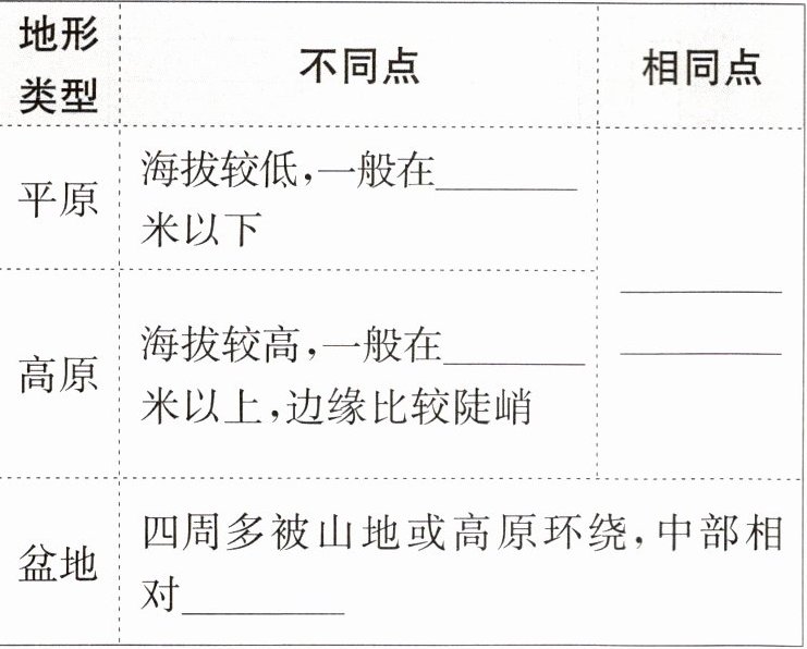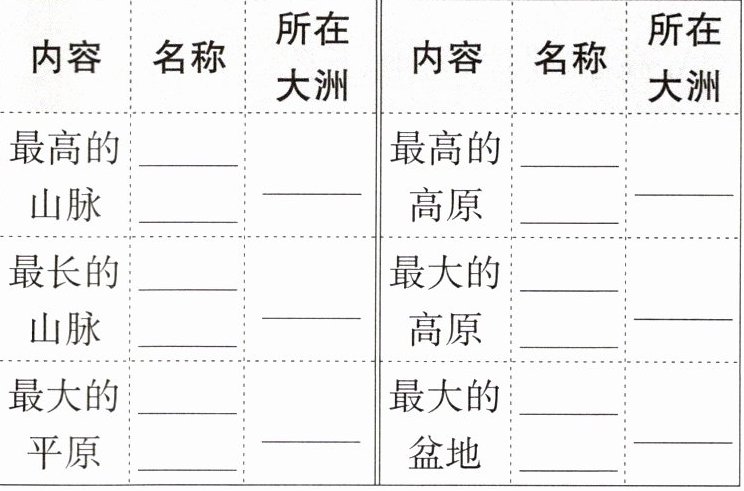 2.(1)平原 高原 盆地 (2)200 500 地表起伏小 低平 500 200 地表崎岖不平 3.(1)太平洋沿岸 科迪勒拉 落基 安第斯 (2)横贯亚欧大陆南部和非洲西北部 喜马拉雅 4.喜马拉雅山脉 亚洲 安第斯山脉 南美洲 亚马孙平原 南美洲 青藏高原 亚洲 巴西高原 南美洲 刚果盆地 非洲