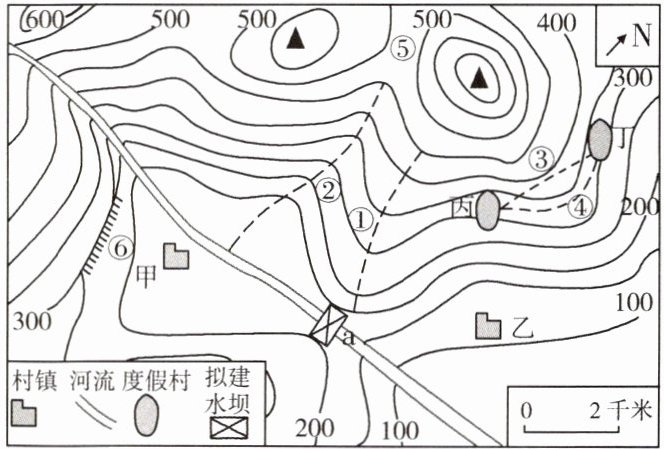1.C [解析]该图的等高距为50米,两处山峰的海拔范围分别是550~600米、600~650米,因此,两处山峰的相对高度范围是0~100米。故选C。 2.D [解析]①处等高线向海拔低处凸出,为山脊,不宜修建溯溪栈道,A项错误;②处等高线向海拔高处凸出,为山谷,易形成河流,过山溜索应该修建在两山峰之间的⑤处,B项错误;峭壁芭蕾要求在天然岩壁或人工岩壁上攀爬,建议设在⑥处,该地等高线重叠,为陡崖,C项错误;水库垂钓要求在最窄出水口处,节约建设成本,建议设在a处,D项正确。故选D。 3.D [解析]度假村丙、丁之间的等高线向海拔低处凸出,为山脊,A项错误;③④两种方案中,③线横穿等高线,地形起伏大,山势险峻,修建难度大,④线沿等高线边缘修建,地势起伏小,难度小,安全性高,D项正确,B、C两项错误。故选D。