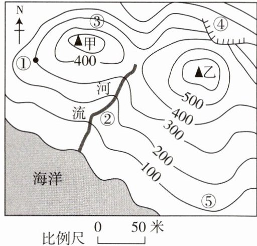 (菏泽模拟)读某地等高线地形图(单位:米),回答 4~5 题。