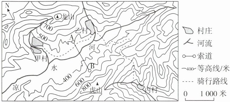 6.C [解析]读图可知,该地地形以山地为主;凉水河自东向西流;索道两端相对高度在100~200米。 7.A [解析]从甲村到乙村大致沿等高线骑行,比较平坦;根据图中等高线数值可知,从乙村到丙村先上坡再下坡。 8.D [解析]甲村与B地没有障碍物遮挡视线;甲村与A地、乙村之间有山脊遮挡视线;甲村与丙村之间有山地遮挡视线。