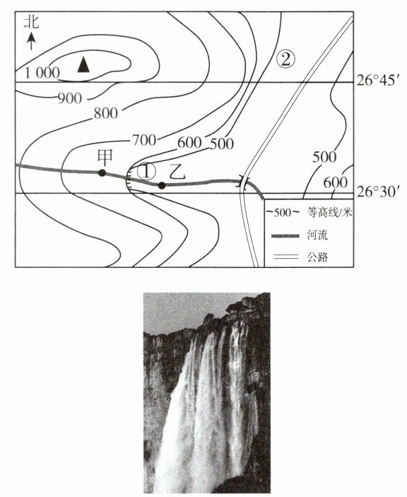 4.B 5.D [解析]河流由高处流向低处,甲处位于瀑布的上游,乙处位于瀑布的下游,A、B两项错误;②处因被山体遮挡,不能拍摄到图示瀑布,C项错误;一般在山谷处容易形成河流,河流遇上陡崖形成瀑布,D项正确。故选D。
