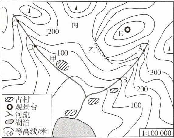 (3)从安全角度考虑,甲、乙、丙三地中最适宜同学们露营的是丙地,原因是丙地地形平坦,安全性较高。乙处为陡崖,图示标志最有可能出现在乙处。