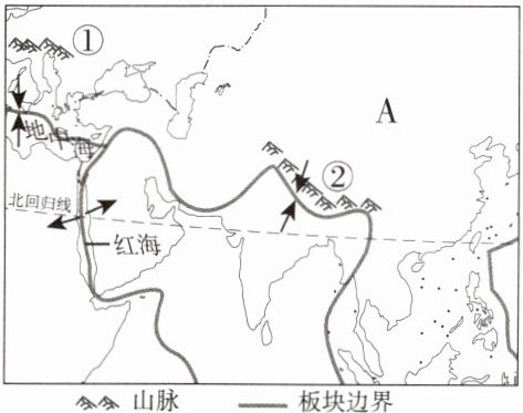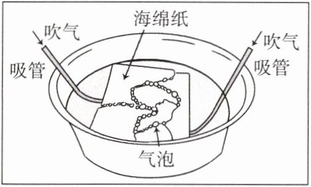 某学生利用盛满水的盆、海绵纸、吸管等材料设计了一个模拟地球表层运动的实验(如图),实验中发现,将吸管插入水中朝盆底吹气时,大量气泡出现在海绵纸交界处。结合下图,回答 7~8 题。
