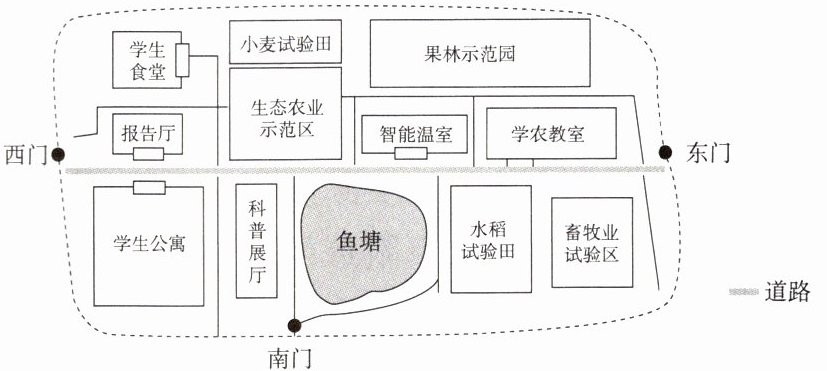 [核心素养](青岛即墨阶段)青岛即墨区某学校组织学生到某学农基地开展实践活动。下面为该学农基地平面图。读图,回答 1~3 题。