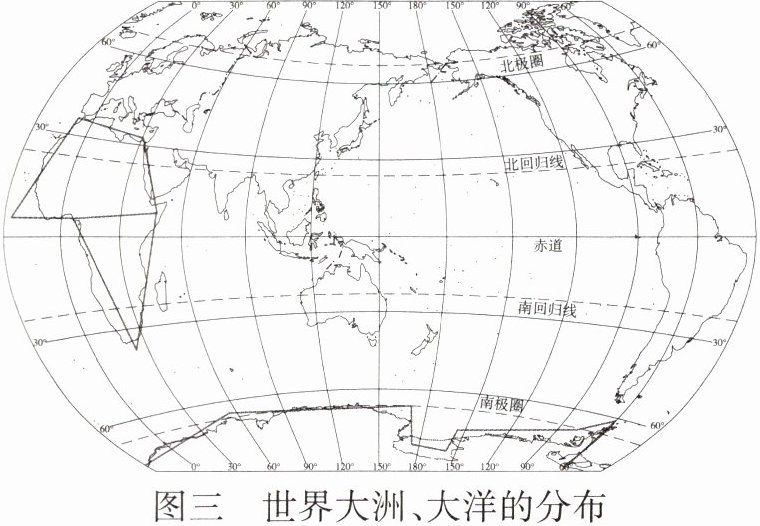(4)地图是我们日常生活和学习地理不可缺少的工具。请在图三中仿照非洲、南极洲简图的画法,任选一个大洲,绘制其几何轮廓。