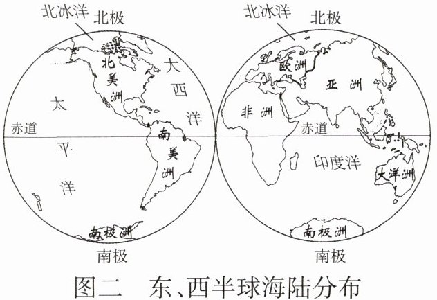 (3)读图二可知,纬度最高的大洲是南极洲,纬度最高的大洋是______,大部分位于西半球的大洲是北美洲和______,从东半球中可以看到完整的大洋是______。
