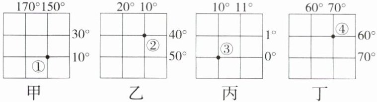8.D [解析]读图可知,①地的经纬度是(10°N,150°W);②地的经纬度是(40°S,10°W),位于中纬度地区、东半球;③地(0°,10°E)位于②地的东北方向;④地比①地纬度高,故④地所在纬线更短。