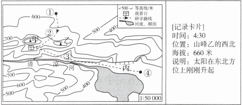 4.B [解析]根据一般定向法可知,①②位于山峰乙的西北方向,而①处海拔为500~600米,②处海拔为600~700米。②处符合记录卡片信息。故选B。
