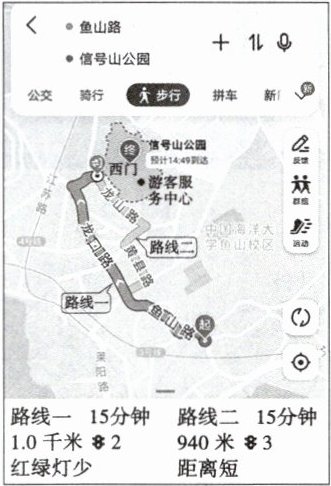 [新情境](青岛市南模拟)家住鱼山路的小明同学到青岛信号山公园游玩,用手机导航软件搜索出行路线方案。下面为手机导航截图。据此回答 1~3 题。