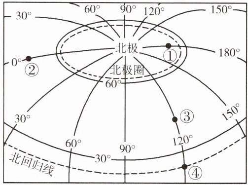 11.B [解析]东西半球的分界线是20°W和160°E这两条经线组成的经线圈,20°W以东、160°E以西为东半球,20°W以西、160°E以东为西半球,②点位于本初子午线上,不在东西半球分界线上,A项错误;③点和④点位于同一条经线上,其时间相同,B项正确;经线指示南北方向,纬线指示东西方向,③点位于①点的西南方向,C项错误;人们规定,0°~30°为低纬度地区,30°~60°为中纬度地区,60°~90°为高纬度地区,④点位于北回归线上,位于低纬度地区,D项错误。故选B。
