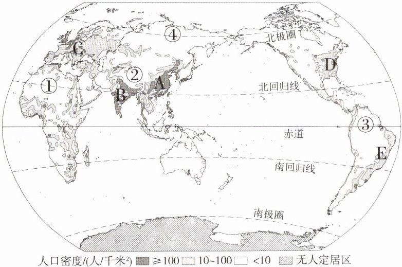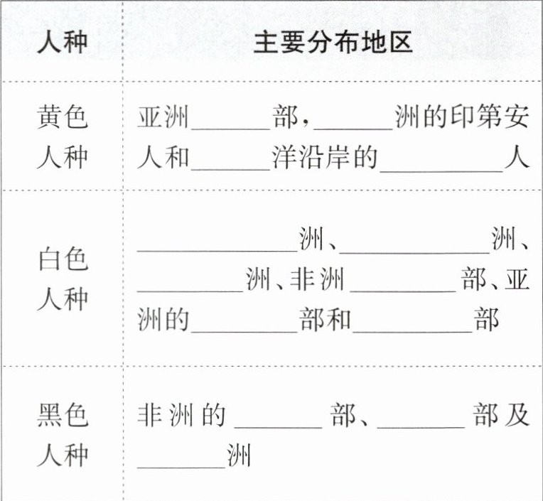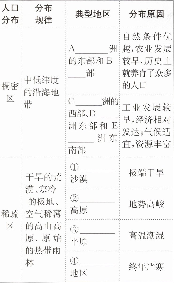 (1)疏密 2.亚 南 欧 北美 南美 撒哈拉 青藏 亚马孙 极地 3.东 美 北冰 因纽特 欧 北美 大洋 北 西 南 中 南 美
