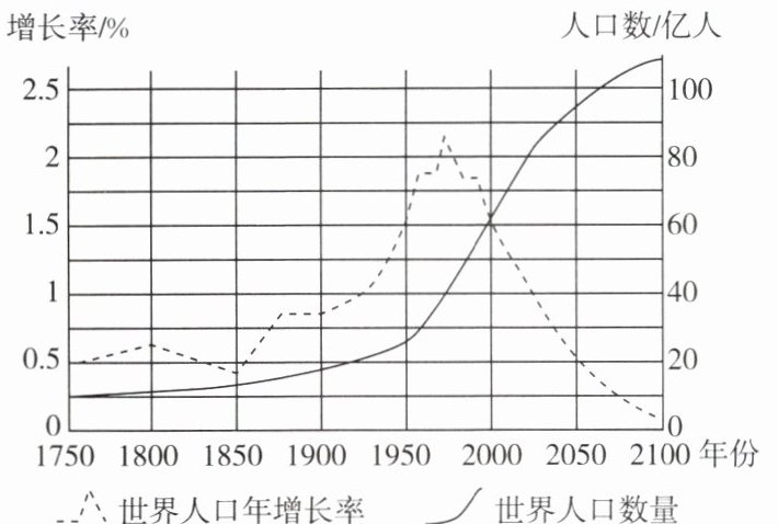 [跨学科]2022 年 11 月 15 日,全球人口达到了 80 亿。下图示意 1750-2100 年世界人口增长情况(含预测)。据此回答 1~2 题。