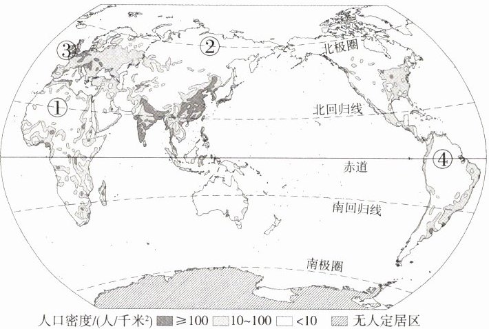 受自然环境和社会经济等因素的影响,世界人口分布很不均衡。读世界人口分布图,回答 5~6 题。