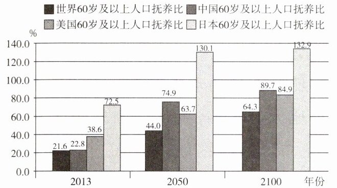 )①图中各国都呈增长趋势 ②日本始终最高 ③美国一直低于世界平均水平 ④2100 年比 2050 年增长幅度最小的是中国