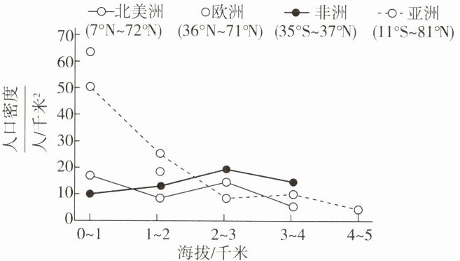 1.A [解析]读图可知,欧洲人口密度最高约为65人/千米²,集中分布在海拔0~1千米处,亚洲人口密度最高约为50人/千米²,集中分布在海拔0~1千米处,A项正确。非洲人口密度最高约为20人/千米²,集中分布在海拔2~3千米处,B项错误。北美洲海拔0~1千米处,人口密度不到20人/千米²,C项错误。欧洲位于中高纬度地区,气温较低,海拔高的地区气候更为寒冷,不适宜人类居住,所以欧洲人口主要分布在海拔较低的地区。非洲大部分地区地处热带、低纬度地区,气候终年炎热,海拔较高的地区气候较为凉爽,适宜人类居住,所以非洲人口主要分布在高海拔地区。所以造成欧洲与非洲人口密度在海拔上存在差异的主要因素是纬度因素,D项错误。故选A。