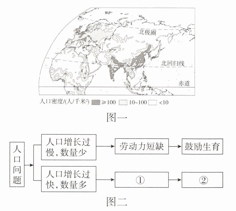 [新考法](青海中考改编)人口密度能够反映人口地理分布的疏密程度,它是指一定时期内,单位面积土地上居住的人口数。分析一个大洲、地区人口密度往往要从自然环境和历史、社会经济条件等方面入手。图一为世界局部人口密度分布图。读图,回答 2~3 题。