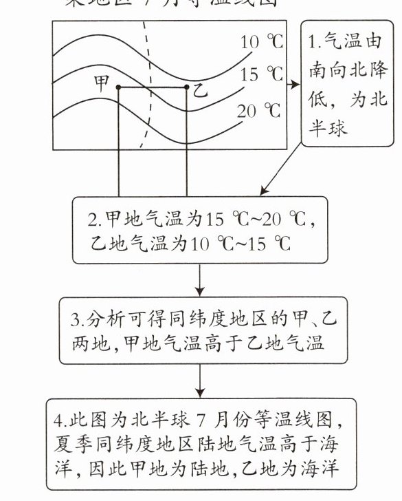 。②等温线呈封闭状曲线,线内温度高,线外温度低,说明该地是