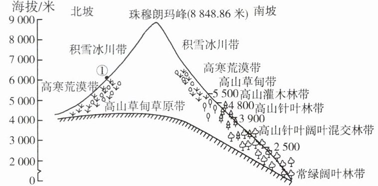 读珠穆朗玛峰南、北坡自然带垂直分布示意图,回答 10~11 题。