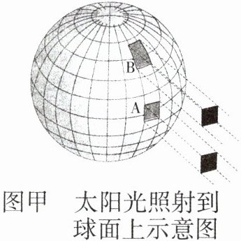 (1)读图甲,两束等量太阳光照射到球面上时,A 地纬度较