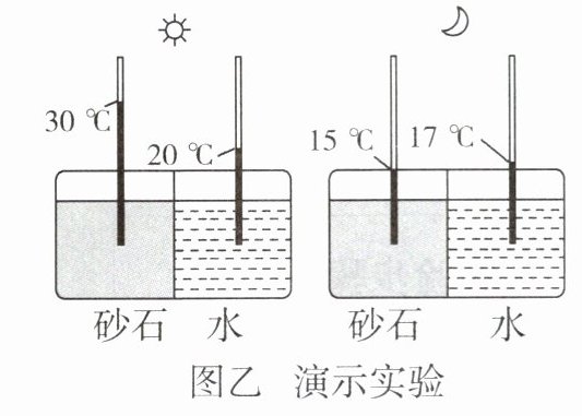 (2)图乙中实验证明,白天砂石温度比水高,夜晚砂石温度比水低。这是因为海陆热力性质不同,砂石(代表陆地)吸热快,散热也快;水(代表海洋)吸热慢,散热也慢。所以,同纬度陆地与海洋相比,夏季